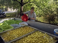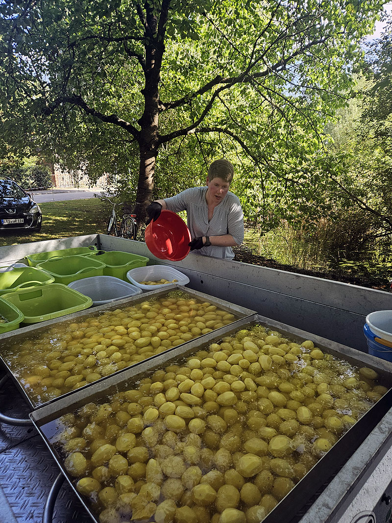 Auch Renate Jentsch ist seit Jahren Teil des Kartoffelfestes. Freitags geht es los mit Schälen. Säckeweise werden die Kartoffel von ihren Schalen befreit und in die Wasserschüsseln platziert. Auch am Festtag selber sorgt sie zusammen mit den vielen anderen Schälerinnen und Schälern immer für Nachschub. Mittlerweile ist das Fest für sie zum Familientag geworden. Sohn Mario mit seiner Frau Kati steht am Bräter für die Kartoffelpuffer, während sie die goldbraunen Plinse verkauft. Sein Bruder Carsten ist nicht nur Ortswehrführer, sondern auch stellvertretender Gemeindewehrführer. Er und die Kameraden der Freiwilligen Feuerwehr sichern die Pufferbäcker und Besucher ab und sorgen für Unterhaltung bei den Feuerwehrfans, egal welchen Alters.